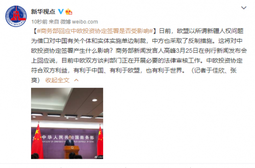 日前,欧盟以所谓新疆人权问题为借口对中国有关个体和实体实施单边制裁,中方也采取了反制措施。这将对中欧投资协定签署产生什么影响?商务部新闻发言人高峰3月25日在例行新闻发布会上回应说,目前中欧双方谈判部门正在开展必要的法律审核工作。中欧投资协定符合双方利益,有利于中国、有利于欧盟,也有利于世界。