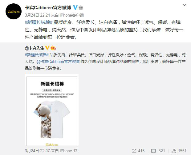 与此同时,不少国产品牌发声力挺新疆棉。