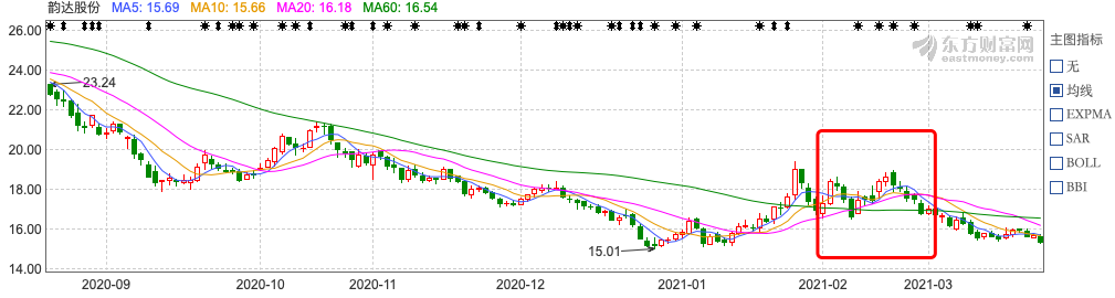 而在1月股价连续上涨并因为投资德邦快递进展的披露收获涨停后,韵达股价在2月股价波动不大。2月1日,德邦股份非公开发行股票申请获得证监会发审会审核通过,韵达股份以战略投资者身份入股德邦正式落地,2月2日韵达股价涨幅达6.42%,而在随后一个月,韵达股价先小幅下跌后小幅上涨,并在月底再次回调。截至2月26日收盘,韵达股价16.79元,环比微跌0.83%。