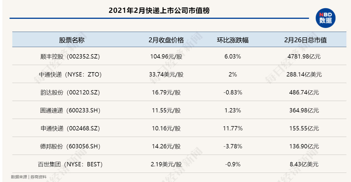 2月申通领涨、德邦领跌 顺丰、中通市值再创新高