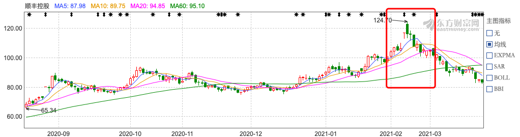 2月10日,顺丰股价在复牌后即涨停,当日最高涨至124.7元,创历史新高,顺丰市值也突破5000亿元,自2020年初至2月10日,顺丰股价增幅已超过160%。此后到二月底,顺丰股价有所回调,截至2月26日收盘,顺丰股价104.96元,环比上涨6.03%。