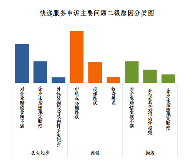 快件丢失短少申诉中主要占比是对企业赔偿金额不满,快件延误申诉中主要占比是中转或运输延误,快件损毁申诉中主要占比是对企业赔偿金额不满。