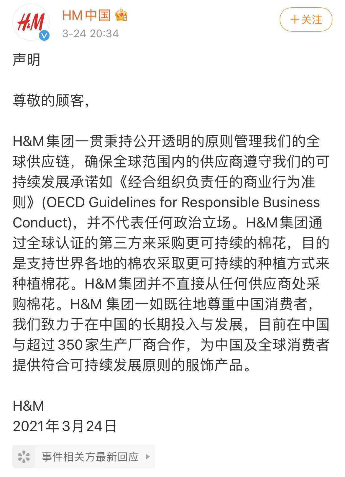 3月24日晚间,H&M发表声明表示,H&M集团一贯秉持公开透明的原则管理我们的全球供应链,确保全球范围内的供应商遵守我们的可持续发展承诺如《经合组织负责任的商业行为准则》,并不代表任何政治立场。