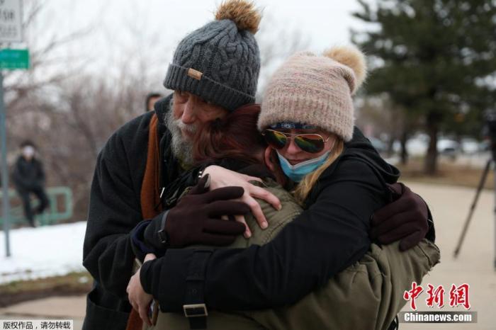 图为科罗拉多州超市枪击事件发生地附近被吓坏的民众互相安慰。