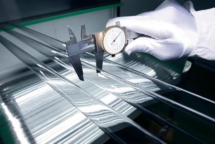 ↑3月9日,某药品包装公司员工在洁净生产车间对玻璃原材料进行检测。记者黄筱摄