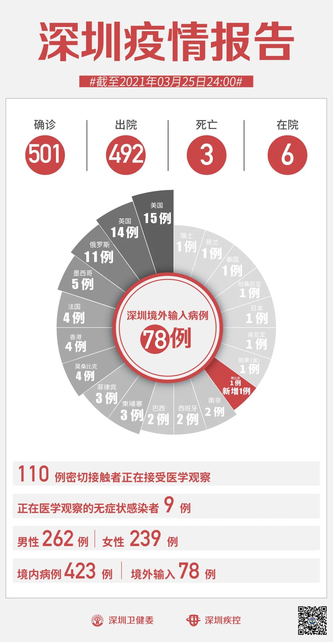 3月25日0-24时,深圳新增1例境外输入确诊病例和3例境外输入无症状感染者。