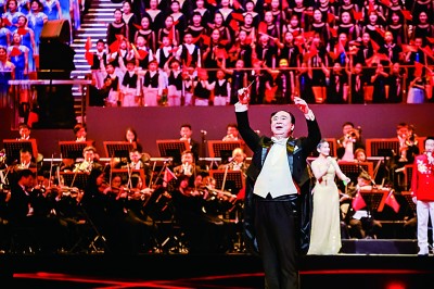 在宁波奥体中心举行的阿拉音乐节上,中央音乐学院院长俞峰指挥演唱《我和我的祖国》。宁波市文化馆供图