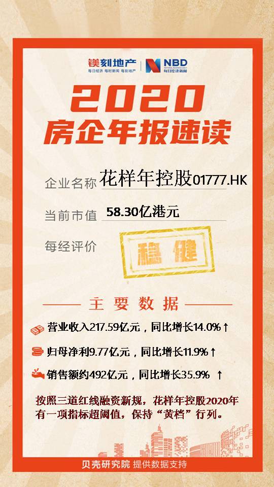 3月26日早间,花样年控股(01777.HK)发布2020年度业绩公告显示,期内实现营业收入约217.59亿元,同比增长约14.0%;公司毛利约为53.4亿元,较上年增长约0.1%,保持稳定;毛利率为24.6%,同比减少3.4个百分点;归属公司拥有人利润约9.8亿元,同比增长11.9%。