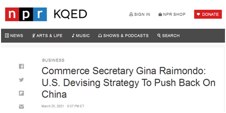 “美国商务部长吉娜雷蒙多:美国正制定战略反击中国。”美国公共广播电台(NPR)当地时间25日以此为题,刊出对商务部长雷蒙多的最新采访。渲染所谓中国“威胁”,宣称要和中国“竞争”,仍是这场访谈的关键词。