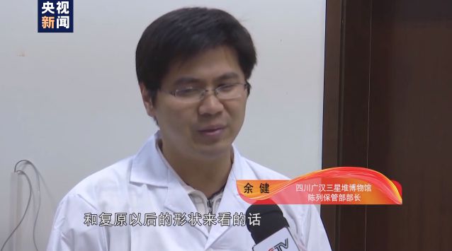 四川广汉三星堆博物馆陈列保管部部长 余健:它的一侧的翅膀和它尾部的尾羽基本上已经残缺了。我们在对它复原的过程中,就要利用一个对称的原则将它残缺的部位进行复原,同时在另外一点像我们这个人首鸟身像它头部的冠饰是残缺的,还有一个就是我们3号神树的底座它也有些残缺,同时这些挂饰底部也是残缺的。那么这些残缺没有修复依据的地方我们就(暂)不进行修复,保留原貌。修复完整以后,也会在第一时间在博物馆给公众进行展出。