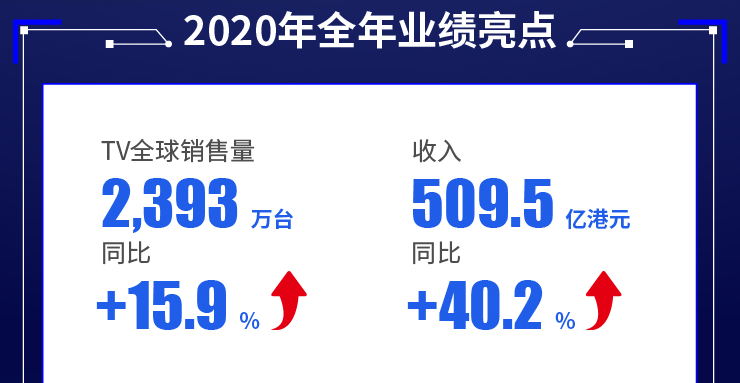 重点值得一提的是,得益于全球领先的产品技术以及完善的产业链布局,全年TCL TV 销售量保持强劲增长,超额完成全年目标。2020年TCL TV全球销售量高达2,393万台,同比增长15.9%。根据Omdia 的最新报告,2020年TCL TV全球销售量市场份额同比提升1.5个百分点至10.7%,排名稳居全球前三。