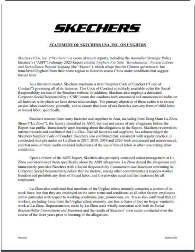 斯凯奇称,绿洲鞋业的雇员中确实有维吾尔人,但他们的工作环境和条件与汉族员工没有不同。包括维吾尔人在内的所有工人,如果不想继续在绿洲鞋业工作,可以自由离职。斯凯奇在2020年6月和11月先后两次对中国相关企业进行过实地考察,均没有一次发现有强制劳工或强制劳工问题的迹象。