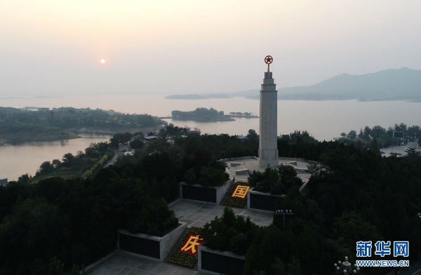 这是2019年10月1日清晨拍摄的河北西柏坡纪念碑(无人机照片)。新华社记者 王晓 摄