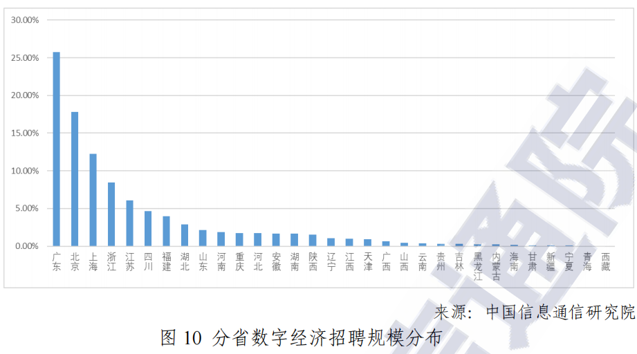 从区域分布来看,数字经济招聘岗位较多的省份包括广东、北京、上海、浙江等地区,岗位规模分别占到全国总岗位的25.74%、17.79%、12.25%和8.46%。