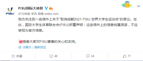 3月26日,国际大学生体育联合会通过其官方微博发布关于“取消成都2021 FISU 世界大学生运动会”言论的回应。