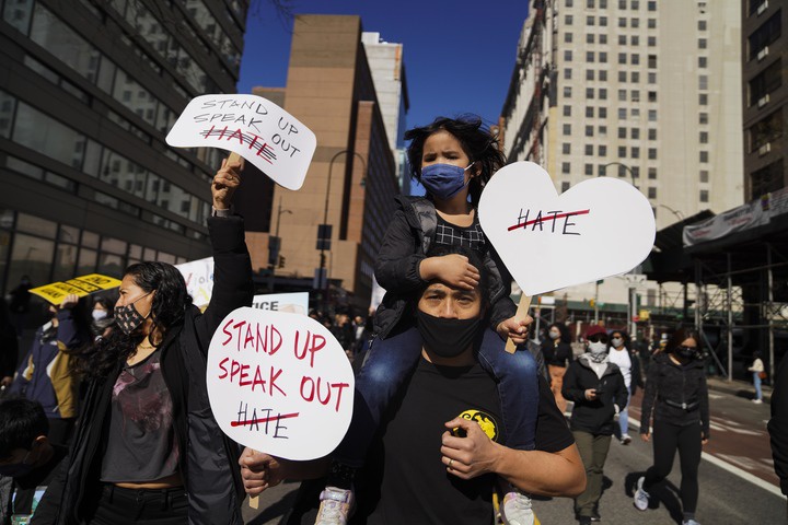 3月21日,在美国纽约,人们集会抗议针对亚裔的歧视行为和仇恨犯罪。新华社记者王迎摄