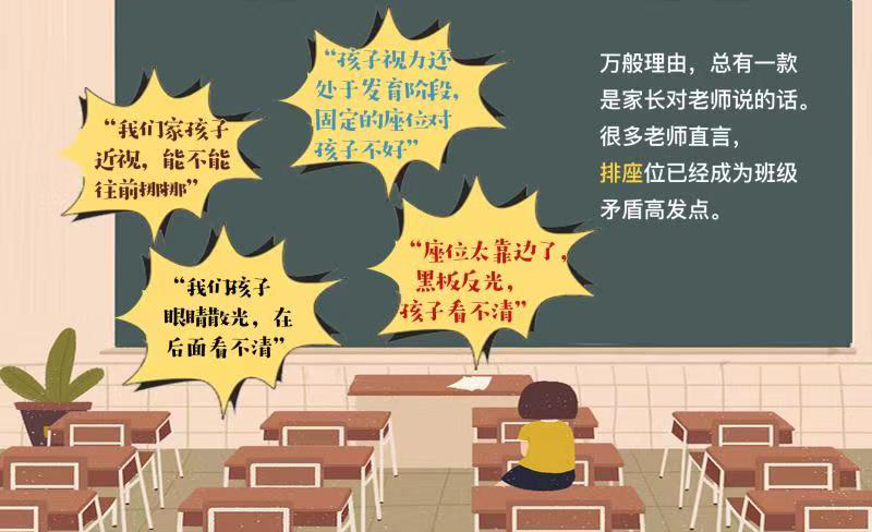 湖南长沙一所小学的班主任张老师也常遭遇排座难题,特别是新生入学时,由于对孩子个人情况不熟悉,入学当天她会随机安排座位,但每次都会有家长提出异议,“不少家长质问我,排座位的依据是什么,为什么自家孩子坐在靠后的位置?”
