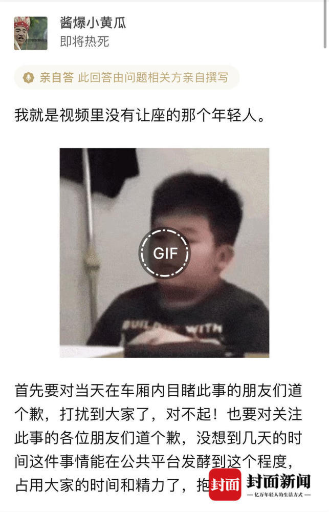3月26日,封面新闻记者联系上“酱爆小黄瓜”,他确认自己就是地铁上被怒怼的年轻人,“不是想抨击大爷的行为,以后看见老人孕妇还是会让座”。同时,他也在知乎上表示,对看到这一事件的乘客表示道歉,“我是不会对那位70岁的大爷道歉的,甚至还想让他给我道个歉。因为这件事我认为自己没有做错。”
