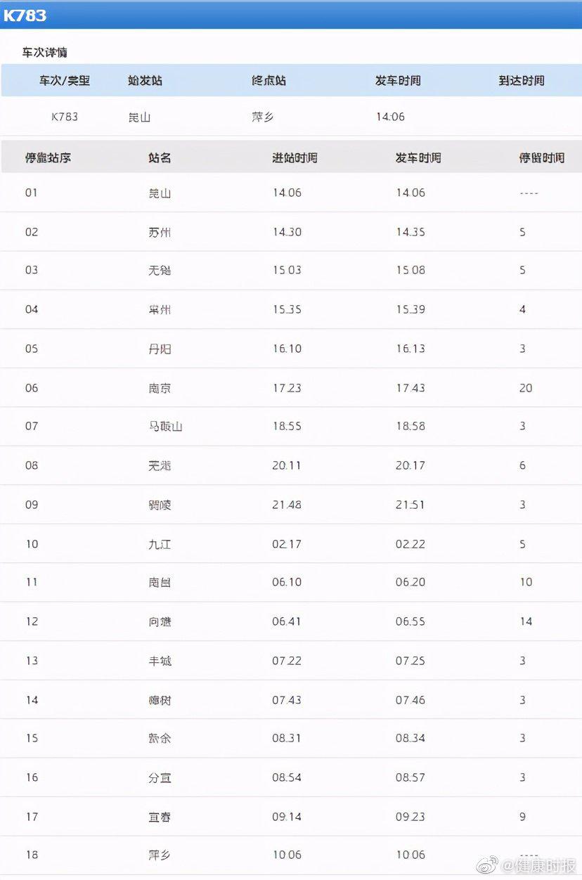 3月27日,据江西省卫健委消息,此前江西省新增1例本土无症状感染者转为确诊病例,系境外输入病例关联确诊病例。据此前公告显示,两人均从南京,乘坐K783次列车抵达江西。记者查询列车时刻表发现,K783次列车始发站为江苏昆山,终点站为江西萍乡,途中停靠站点有16个,而自南京站至终点站,途径马鞍山站、芜湖站、铜陵站、九江站、南昌站等12个站点,分别有3-20分钟不等的停靠时间。