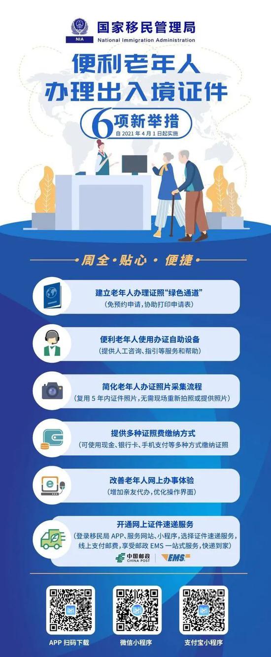 移民局互联网政务服务平台通过网站、移民局APP、第三方平台等线上渠道,为老年人等广大群众提供证件速递、邮费支付、全程速递信息查询等便民服务。
