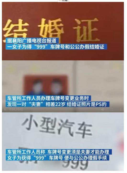 近日,湖北襄阳,一女子为得“999”车牌号,与公公办理假结婚证。车管所工作人员称,车牌号变更须是夫妻才能办理,原车牌号在女子公公名下,女子便与公公办理假手续。