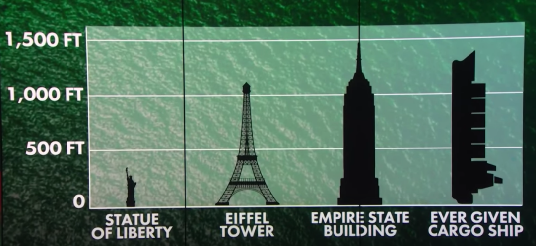 “长赐”号货轮的长度和纽约帝国大厦高度相当。图片来源:CNBC截屏