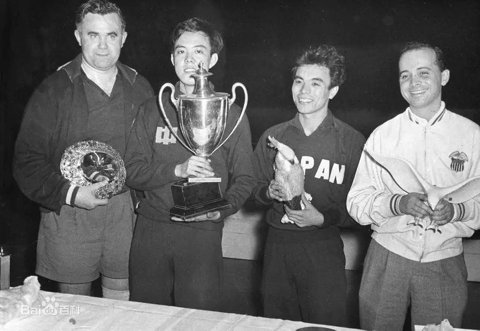 1961年4月9日,在新落成的北京工人体育馆内,容国团力克强敌,帮助中国男乒夺得第26届世乒赛团体冠军。