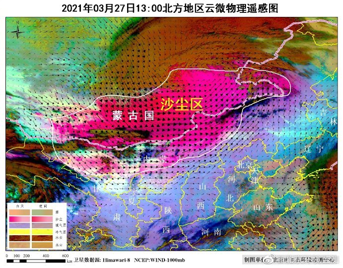 北京市生态环境监测中心介绍,根据27日8时至13时北方地区云微物理遥感图,蒙古国南部大范围沙尘持续向东南传输,目前已经影响我国内蒙古中部地区。