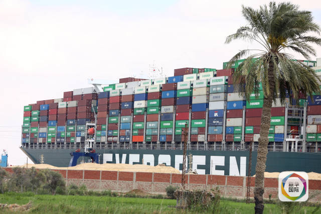 这是3月26日拍摄的搁浅在埃及苏伊士运河上的重型货船。(新华社发,艾哈迈德·戈马摄)