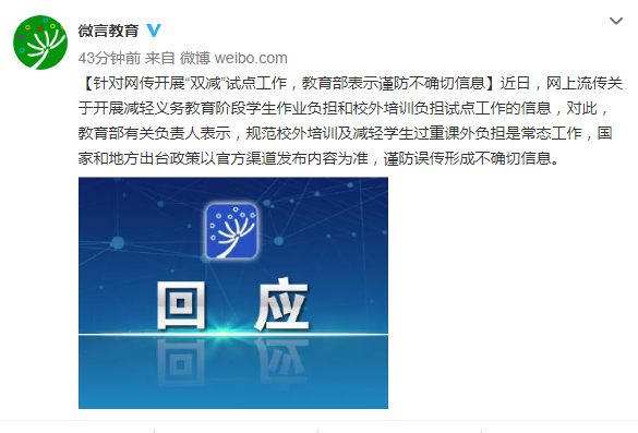 1丨针对网传开展“双减”试点工作,教育部回应:谨防不确切信息