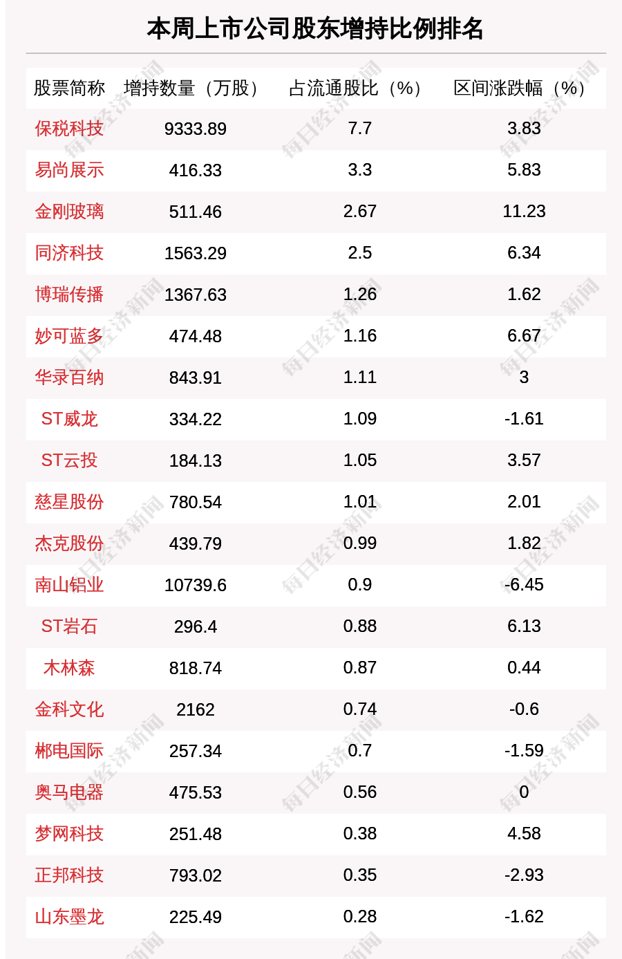 从增持力度上来看,本周获股东增持比例(占流通股比)前三的公司是保税科技、易尚展示、金刚玻璃,增持比例分别为7.7%、3.3%、2.67%。