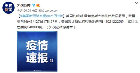 【美国新冠肺炎超3021万例】美国约翰斯·霍普金斯大学统计数据显示,截至美东时间3月27日17时27分,美国累计新冠肺炎确诊病例达30212225例,累计死亡病例548800例。(央视记者徐德智)