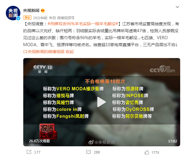 江苏省市场监管局抽查发现,有的品牌以次充好、缺斤短两:羽绒服实际含绒量比吊牌所写虚高47倍,检测人员感慨没见过这么差的衣服;围巾号称含96%的羊毛,实际一根羊毛都没…七匹狼、VEROMODA、雪中飞、恒源祥等均被点名。抽查超10家电商直播平台,三无产品层出不穷。(央视新闻)