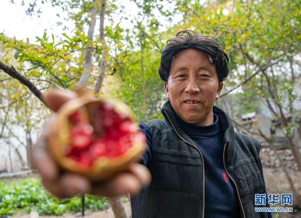桑登在展示自己种出来的石榴(3月18日摄)。记者 陈尚才 摄