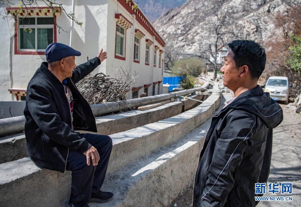 被害农奴之一向秋的儿子、今年78岁的邓都(左)向村里的年轻人介绍水渠的情况(3月19日摄)。记者 孙非 摄