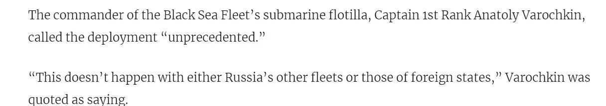 作为回应,俄罗斯黑海舰队的全部6艘潜艇在19日当天尽数离开基地,赴海上执行警戒任务。黑海舰队海军上校瓦拉奇金表示,这种情况无论在俄罗斯舰队还是在其他国家舰队的历史上都从未出现过。