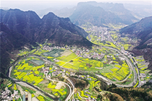 油菜花田环抱着小南海镇大路坝社区的民居。通讯员 杨敏 摄