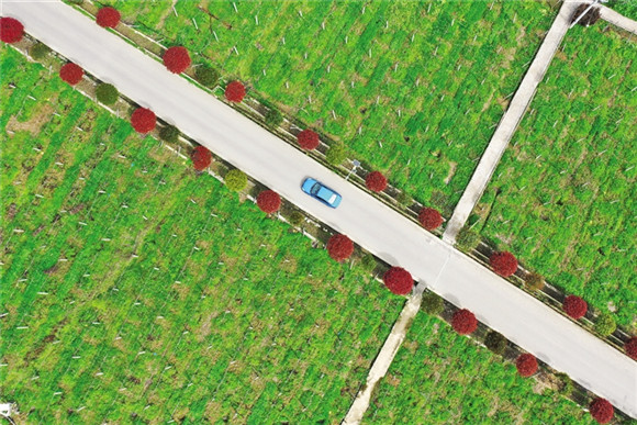 一辆自驾游车行驶在黔江区市级现代农业产业园猕猴桃种植基地的红石楠产业路上。通讯员 杨敏 摄