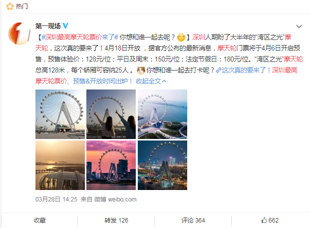 深广电第一现场2021年3月29日讯 深圳人期盼了大半年的“湾区之光”摩天轮,这次真的要来了!4月18日开放,据官方公布的最新消息,摩天轮门票将于4月6日开启预售,预售体验价:128元/位;平日及周末:150元/位;法定节假日:180元/位。“湾区之光”摩天轮总高128米,每个轿厢可容纳25人。