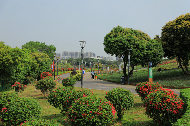 公园栽植了众多荔枝树,如今已到了开花的时节,小小的花朵随风而动,让人不由得期待结果成熟的时刻。黄花风铃木也是深圳常见的一种植物,明黄色花朵在枝头盛放,与周遭的风景搭配的恰到好处。除此之外,立新湖公园还有桂花、三角梅、红花檵木、九里香、假连翘、木棉花、紫荆花等南方本土植物上百种,最是适合前来踏青赏花。