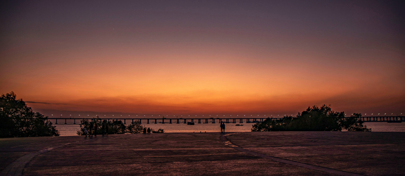 西湾红树林公园是宝安西部活力海岸带的关键生态节点,位于宝安西部海岸带中段,总长约4.9公里。公园以“多彩西湾,活力生活”为主题,以走近红树林为特色,集休闲、游憩、生态、科普为一体,为市民和游客提供一处具有休闲、游憩、娱乐、生态等多功能的综合性公共场所。公园复原了代表本土优秀文化与历史的清代固戍码头、百年书屋绮云书苑、固戍碉楼、红家围等历史风貌;修建了红树广场、南昌镜湖、云帆桥等特色景点。设计巧妙借用海湾、海上长桥、地铁高架,长桥卧波,内湖外海,浑然一体。