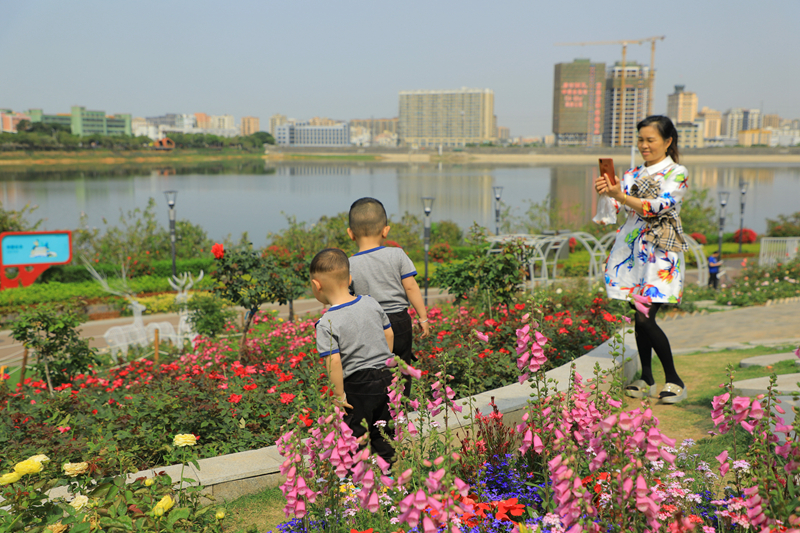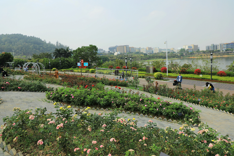 立新湖公园内沿湖畔还建设了花田,不同的季节有不同的花儿开放。今年的春季栽培了成片的月季花,此时正春意盎然,花开绮丽。