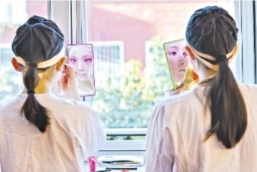 参与汉剧名家名段演唱会的演员演出前化妆。