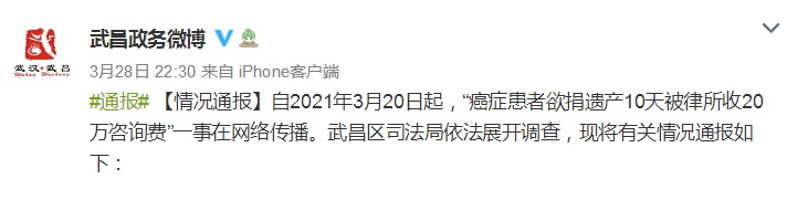 @武昌政务微博3月28日晚间发布情况通报:自2021年3月20日起,“癌症患者欲捐遗产10天被律所收20万咨询费”一事在网络传播。武昌区司法局依法展开调查,现将有关情况通报如下: