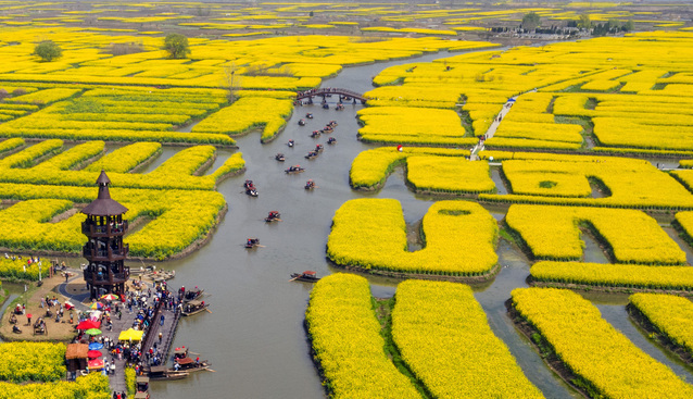 2021年3月28日,游客在江苏泰州兴化市千垛景区乘船观看油菜花。近日,江苏泰州兴化市千垛景区的油菜花进入盛花期,形成“河有万湾多碧水,田无一垛不黄花”的壮观景色。河港纵横、菜花飘香,从空中俯瞰,块块隔垛宛如漂浮于水面的岛屿,泛舟其中,如入迷宫,旖旎风光令人流连忘返。视觉中国