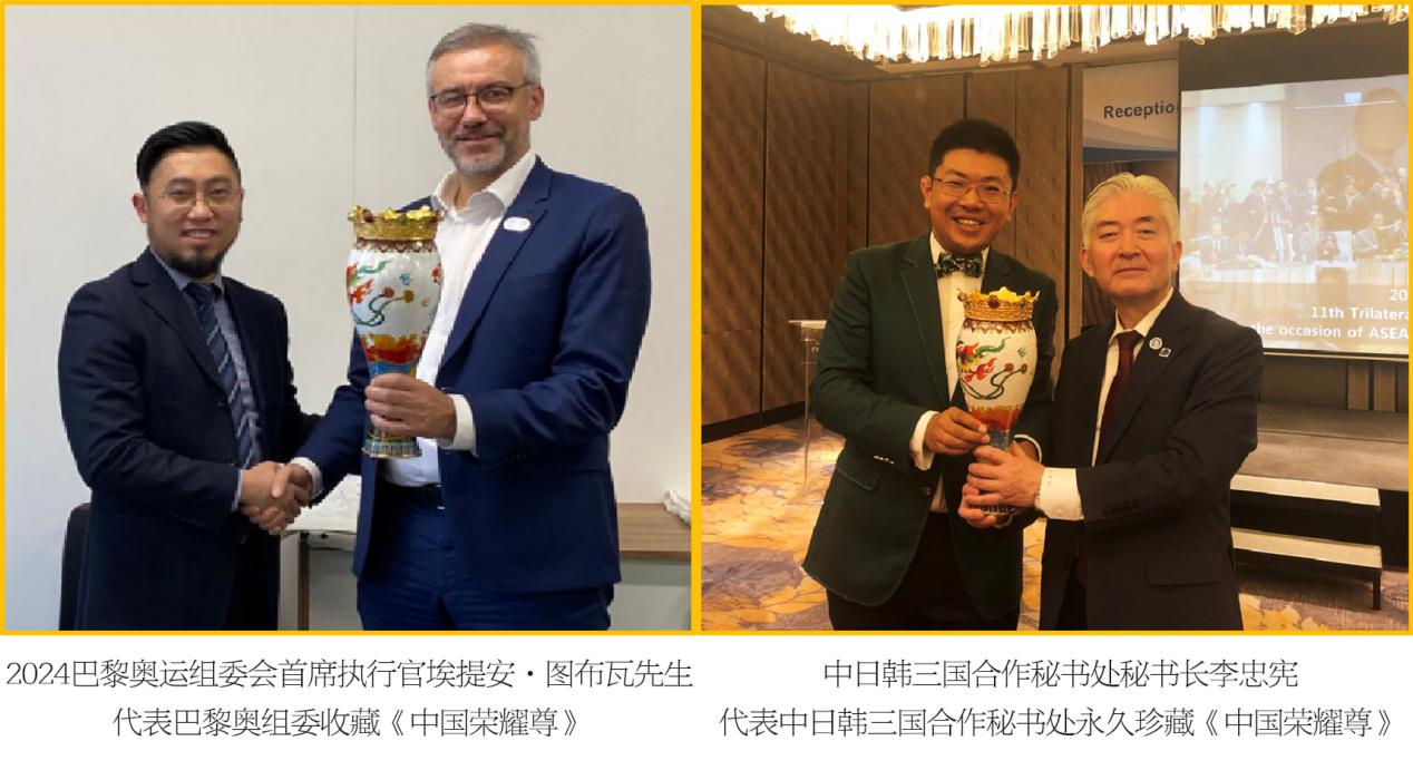 《中国荣耀尊》一经诞生即获得了来自世界各国的认同。东京奥组委、巴黎奥组委、中日韩三国合作秘书处、亚奥理事会四大国际机构重磅收藏,中日韩三国合作秘书处秘书长称:“这是来自中国的宝物,一定会永久珍藏!”