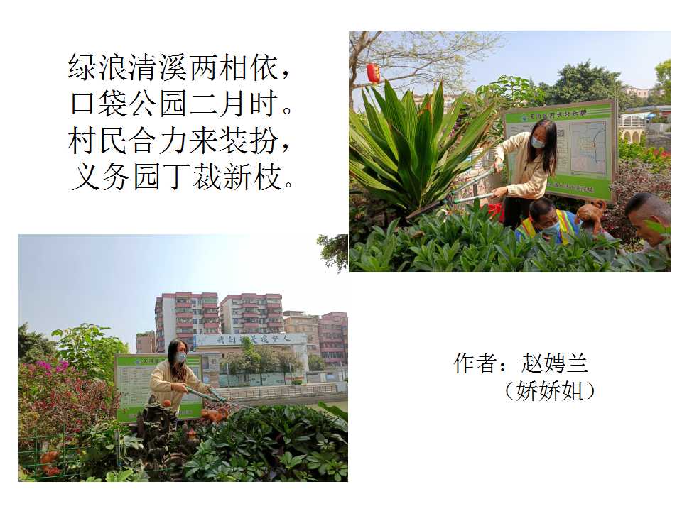 车陂西岸的娇娇姐,正在修剪着公园里的花枝,并为这辛勤的画面配诗一首:“绿浪清溪两相依,口袋公园二月时。村民合力来装扮,义务园丁裁新枝。”诗与画都很生动地展现出“水清、景美、人和善”的车陂美好图景。