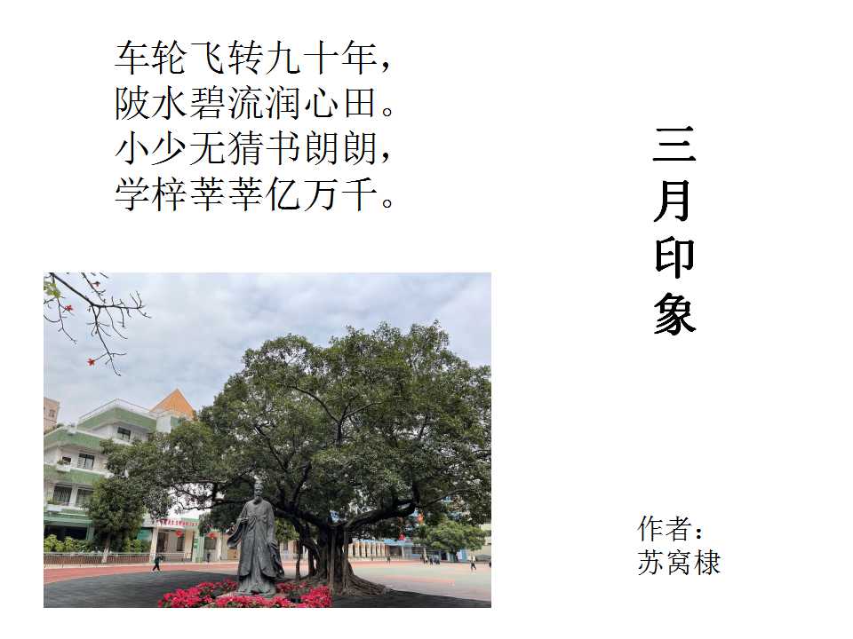 苏窝棣当过老师,对车陂小学有深厚感情。他拍摄的是车陂小学风景,大榕树下,东坡塑像,红花绿树,生机盎然,并赋诗一首《三月印象》:“车轮飞转九十年,陂水碧流润心田。小少无猜书朗朗,学梓莘莘亿万千。”