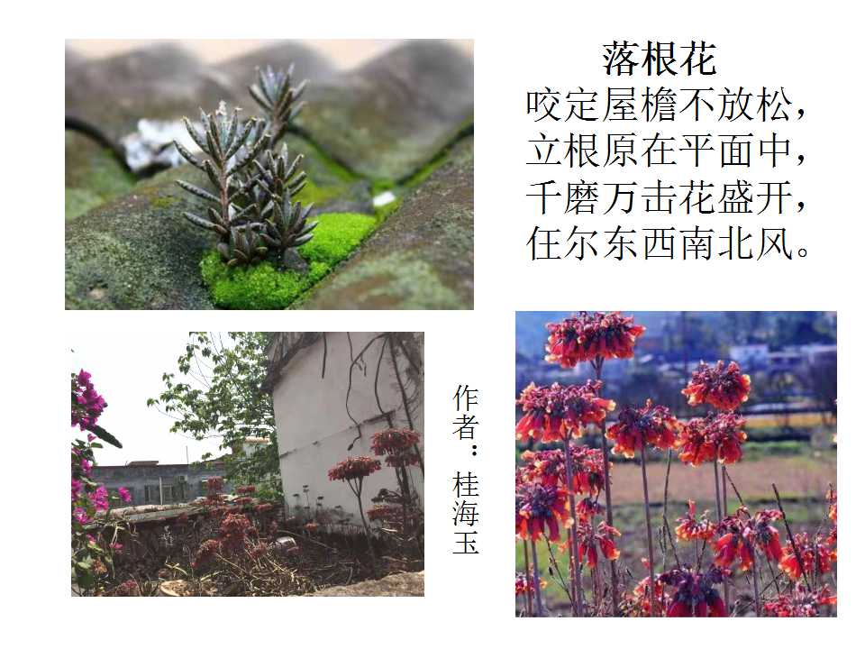 桂海玉写了《落根花》:“咬定屋檐不放松,立根原在平面中,千磨万击花盛开,仼尔东西南北风。”此诗是套用清代诗人“郑燮”的《竹石》:“咬定青山不放松,立根原在破岩中。千磨万击还坚劲,任尔东西南北风。”