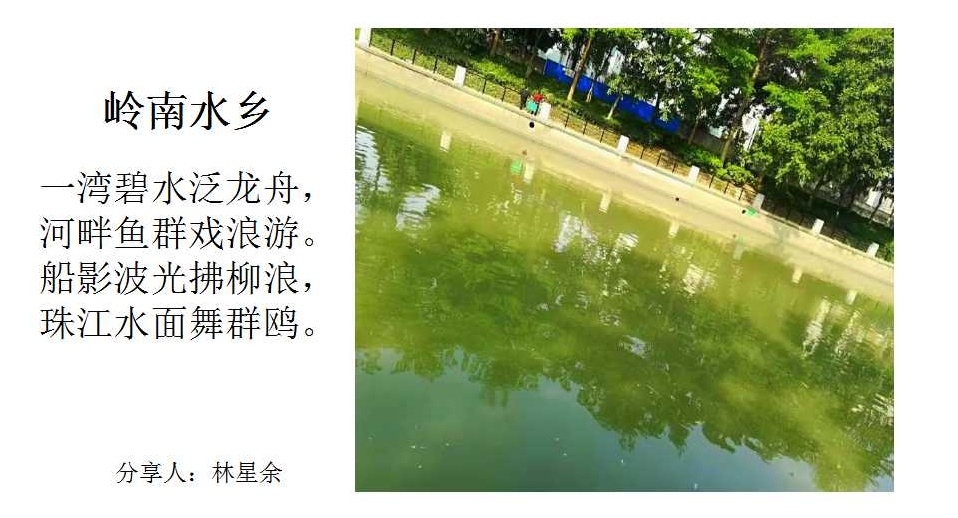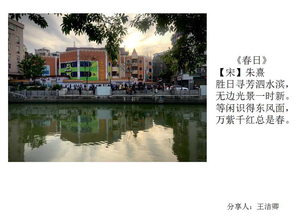 王洁卿以车陂幼儿园倒影在车陂涌的图片,配上宋代朱熹的《春日》诗作:“胜日寻芳泗水滨,无边光景一时新。等闲识得东风面,万紫千红总是春。”